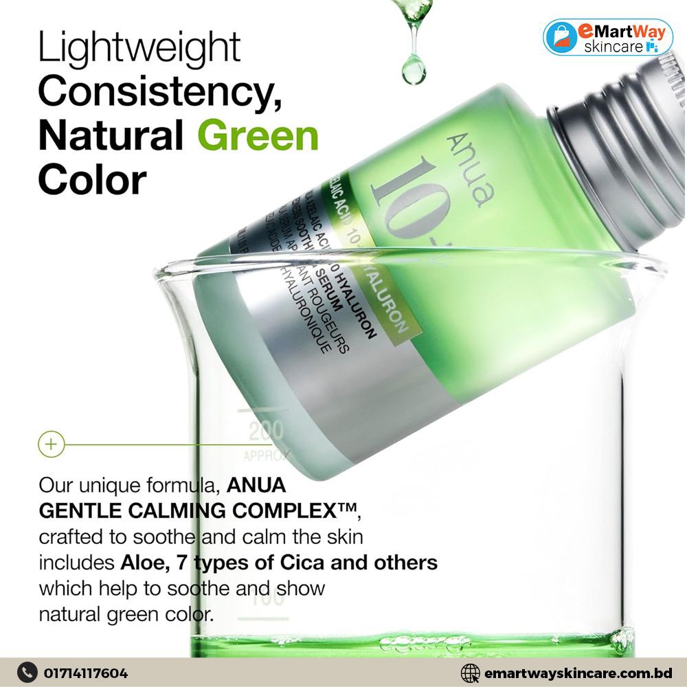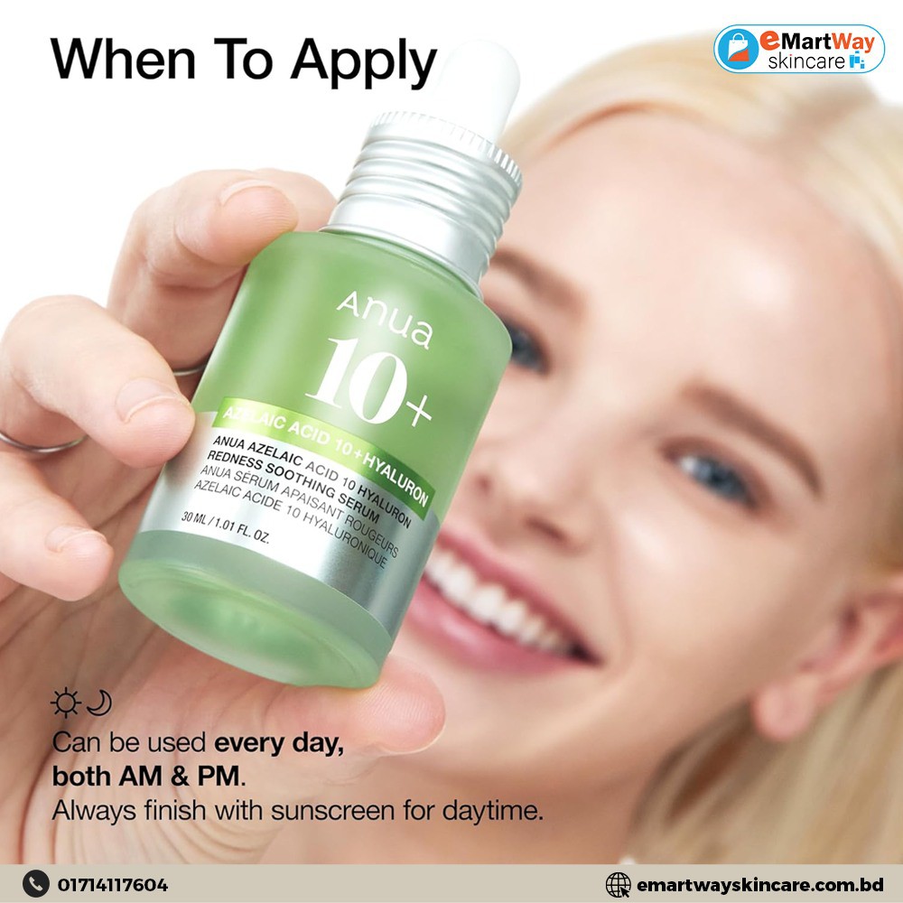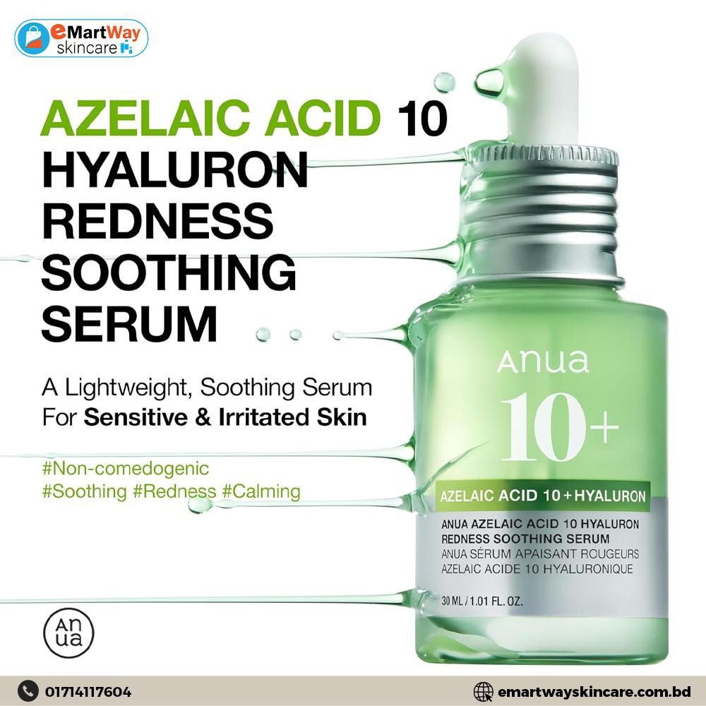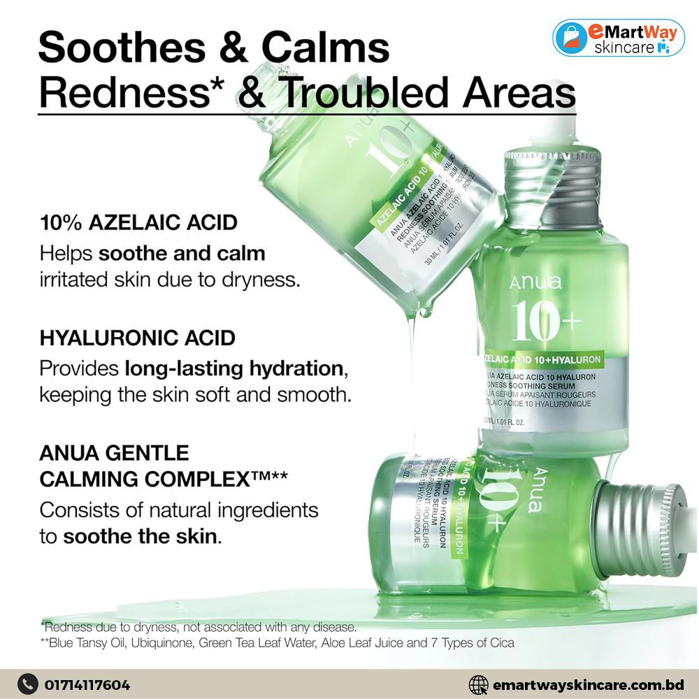 ANUA Azelaic Acid 10% Hyaluron Redness Soothing Serum formulated with soothing & hydrating ingredients, suitable for sensitive skin, helps improves redness and troubled areas. Formulated with skin-soothing and hydrating ingredients, the ideal solution for sensitive and irritated skin due to dryness. It helps calm redness while deeply moisturizing for a balanced, healthy complexion. A lightweight serum formulated with soothing & hydrating ingredients, suitable for sensitive skin, helps improves redness and troubled areas.