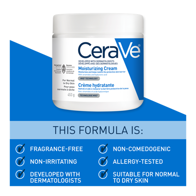 CeraVe Moisturizing Cream includes three essential ceramides and hyaluronic acid to effectively hydrate the skin and restore the skin’s protective barrier. Developed with dermatologists and suitable for normal and very dry skin on the face and body, this rich, non-greasy, fast-absorbing moisturizing cream features our patented MVE Delivery Technology to release a steady stream of moisturizing ingredients throughout the day and night. CeraVe Moisturizing Cream with ceramides is fragrance free.