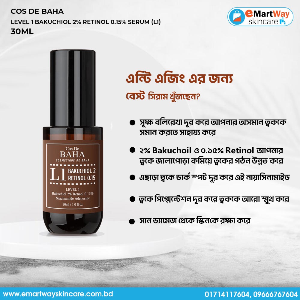 Formulated with 2% Bakuchiol and 0.15% Retinol, Cos De Baha L1 Bakuchiol 2 Retinol 0.15 Serum is an anti-aging serum that smooths skin texture, improves the look of fine lines and wrinkles, and brightens uneven skin tone.