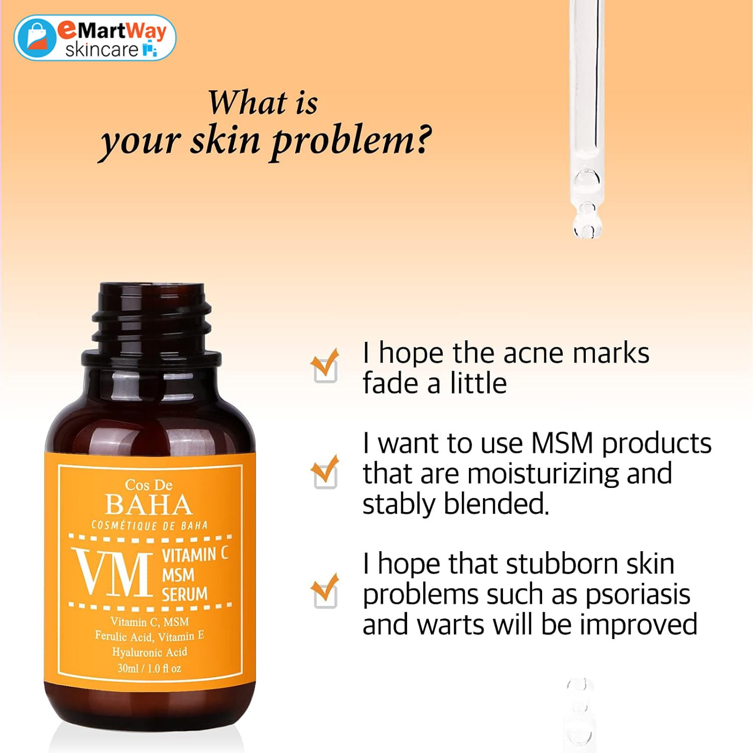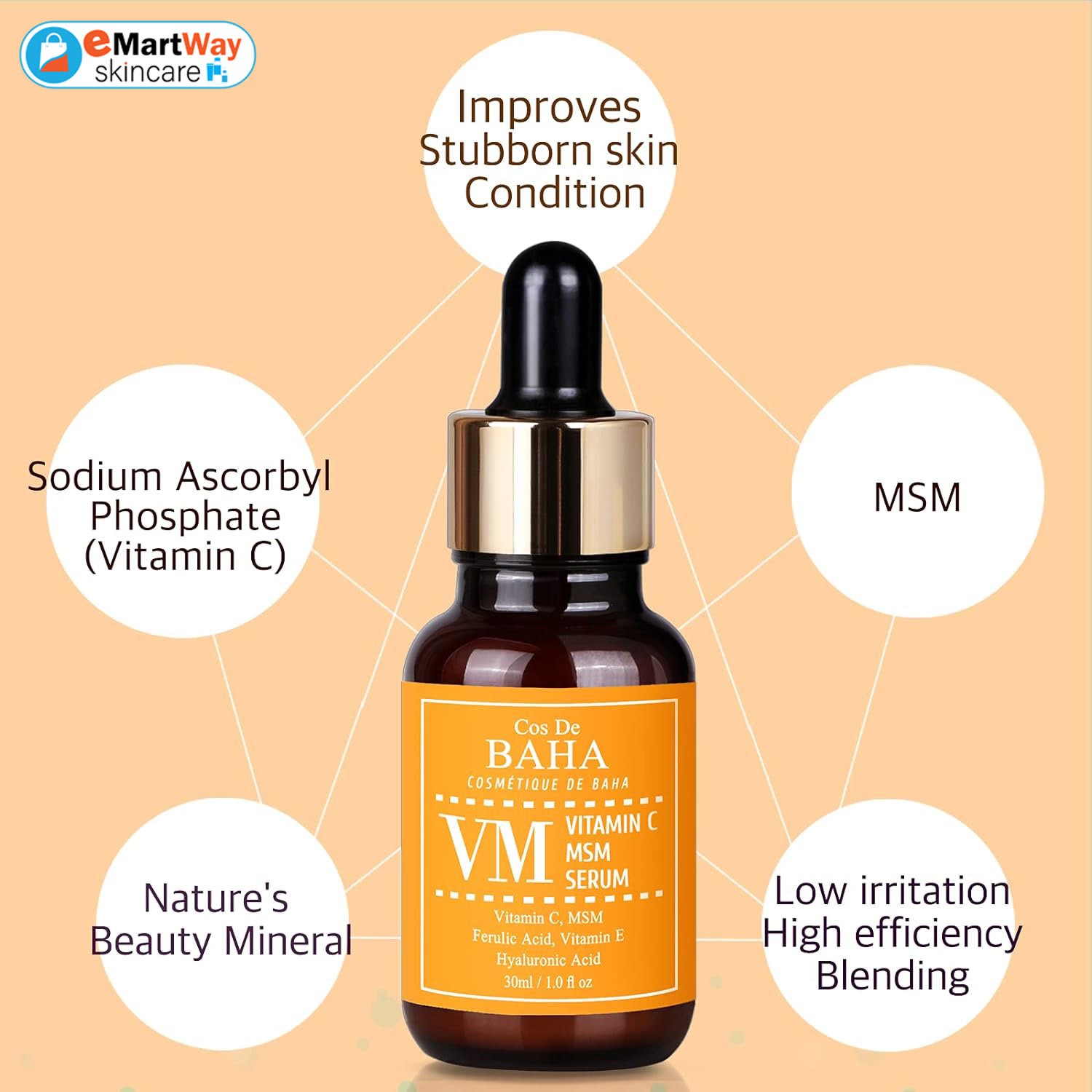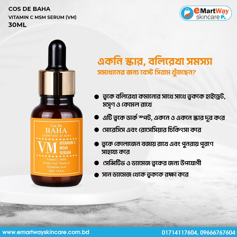 Cos De BAHA Vitamin C MSM Serum (VM) is a fast-absorbing serum, infused with vitamin C, MSM, Ferulic Acid and vitamin E, hydrates and firms your skin while reducing wrinkles for a radiant appearance.