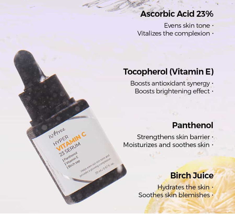 Water, Ascorbic Acid (23%), Propanediol, Betaine, 1,2-Hexanediol, Polyglycerin-3, Tromethamine, Ethyl Ascorbyl Ether, Hydroxyethyl Urea, Betula Platyphylla Japonica Juice, Ethylhexylglycerin, Adenosine, Disodium EDTA, Panthenol, Gardenia Florida Fruit Extract, Dextrin, Tocopherol