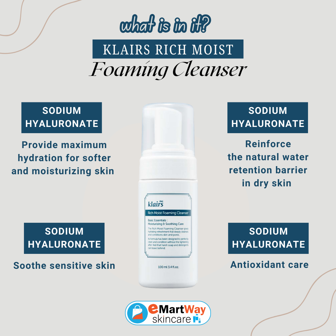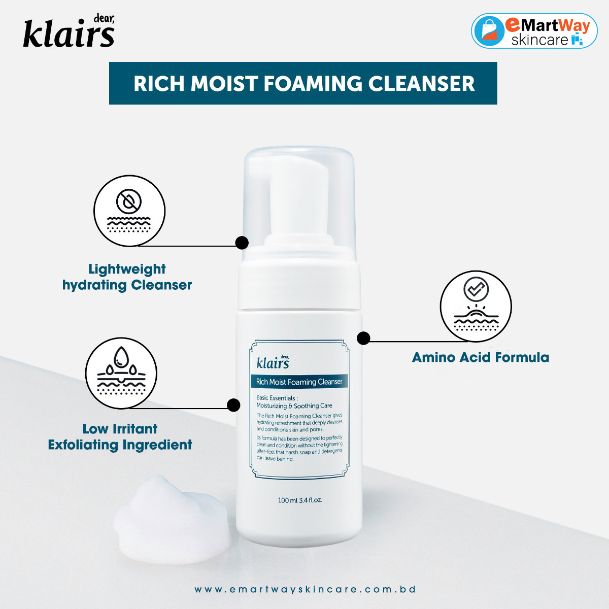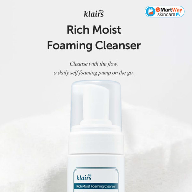 Klairs Rich Moist Foaming Cleanser is a a gentle yet effective way to cleanse their skin. This foaming cleanser is specially formulated for those with acne-prone skin or melasma skin, handling skin delicately and an addition to any Korean skincare for acne. The Rich Moist Foaming Cleanser is designed to cleanse the skin without stripping it of its natural oils. It is formulated with a blend of natural ingredients, including centella asiatica extract, the miracle healing powerhouse The cleanser also contains hyaluronic acid, which helps to hydrate and moisturize the skin, leaving it feeling soft and smooth.