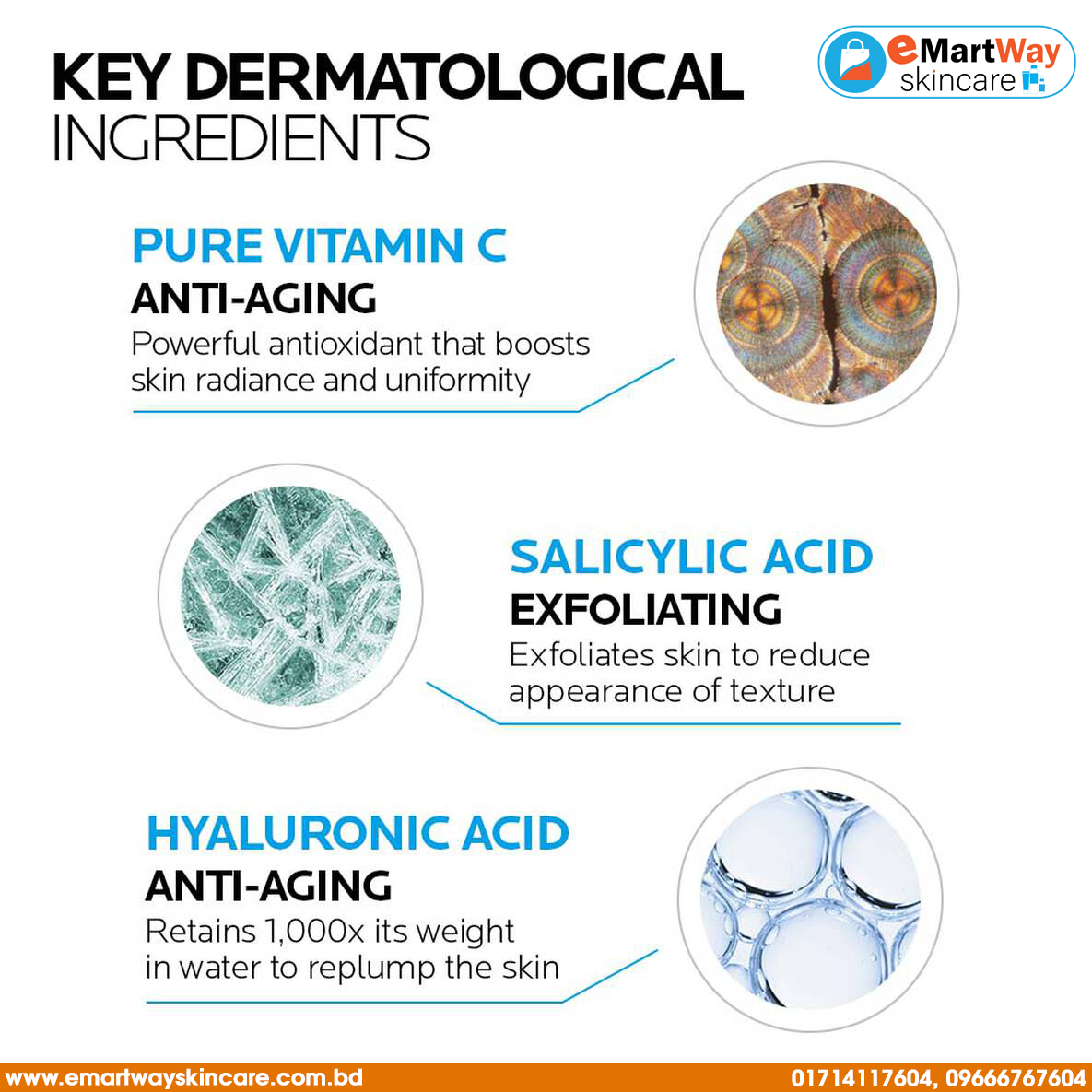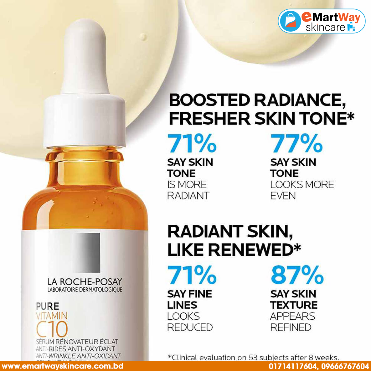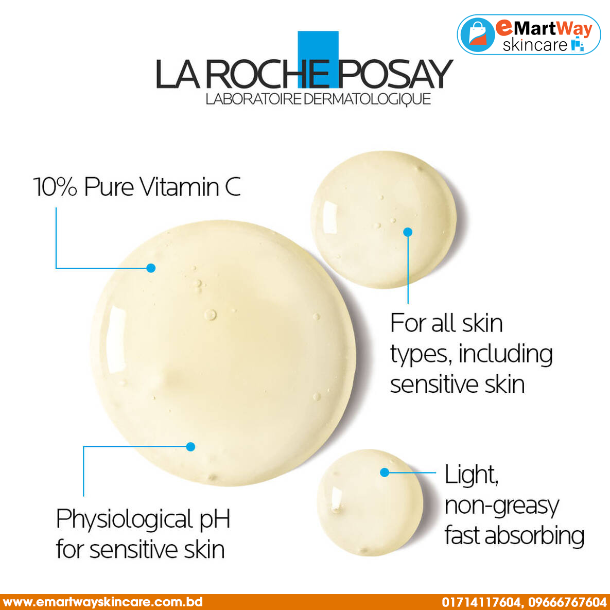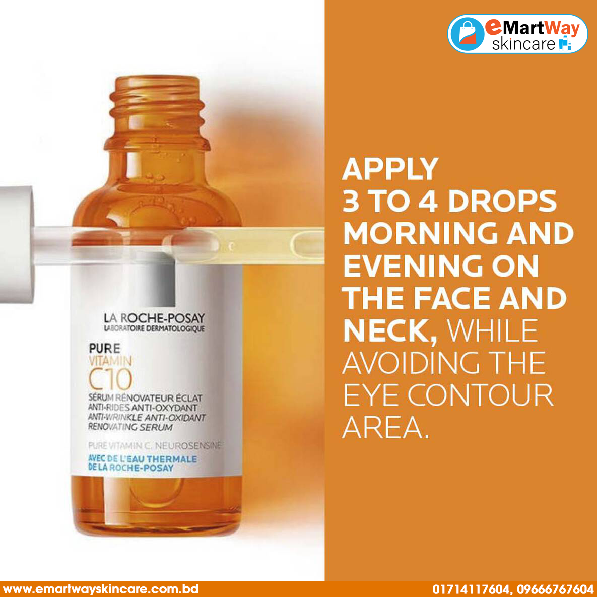 How to use : Apply La Roche-Posay Pure Vitamin C10 Serum to the skin in the morning and evening, while taking care to avoid the eye contour area. Follow the application of this product with an appropriate sunscreen.