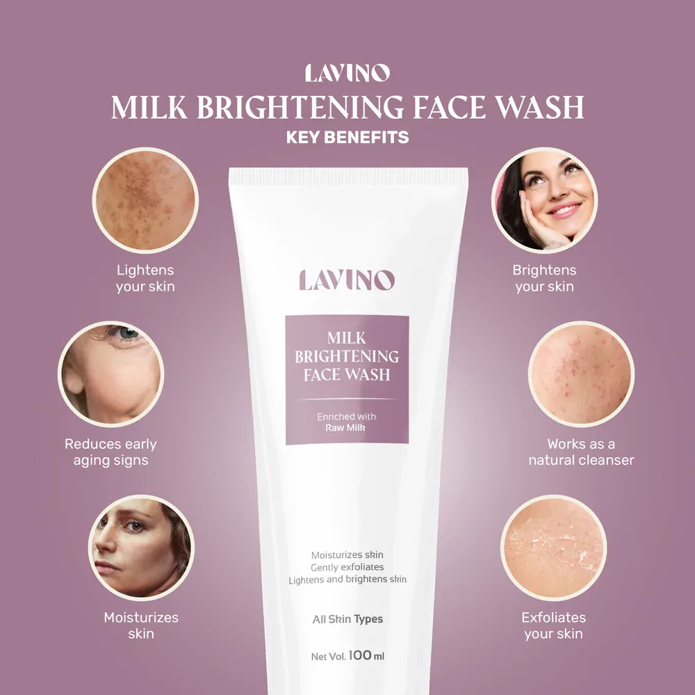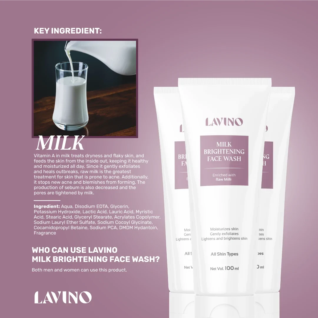 Ultra-soothing and super nourishing Lavino Milk Brightening Face Wash deeply cleanses dirt from the skin. It consists of milk. Milk contains lactic acid, a natural and mild exfoliator that helps to remove dead skin cells to make spotless, moisturized, and brighter-looking skin.