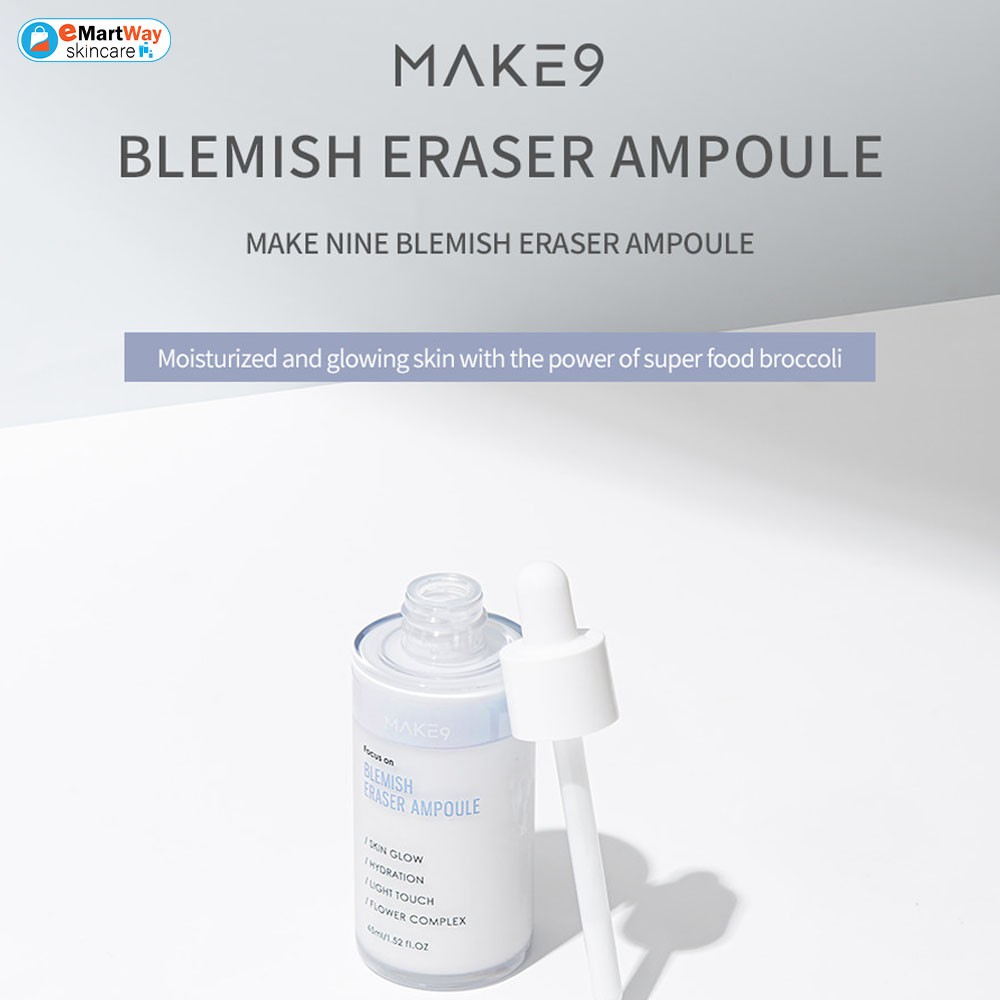 MAKE9 Focus On Blemish Eraser Ampoule is a top Korean beauty product that combines the power of superfood broccoli with other beneficial ingredients. Here are the key features and benefits of this ampoule Skin Brightening and Even Toning The ampoule contains Niacinamide, a whitening ingredient, which helps even out skin tone and reduce pigmentation. Broccoli extract, rich in vitamin C (twice as much as lemons), contributes to skin clarity and radiance. Hydrating and Glowing The light texture of the Blemish Eraser Ampoule ensures quick absorption without stickiness. It provides sufficient moisture to every corner of the skin, leaving it lively and bright.