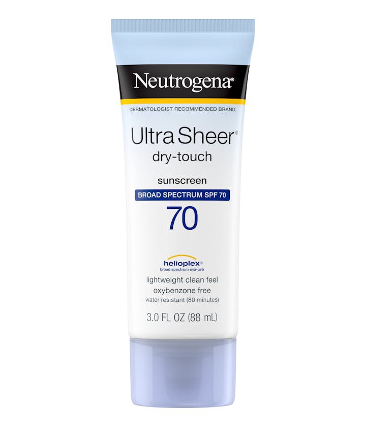 Neutrogena Ultra Sheer Dry-Touch Sunscreen Broad Spectrum Dry-Touch, with SPF 70, broad spectrum sunscreen provides powerful sun protection. Featuring Avobenzone, Homosalate, Octisalate, Octocrylene as active ingredients, this non-greasy body sunscreen is oxybenzone-free, Hawaii Act 104 compliant. With Helioplex technology to provide superior UVA/UVB protection from aging UVA rays and burning UVB rays. Enriched with antioxidant vitamin E, the lightweight SPF sun screen lotion with Dry-Touch technology absorbs fast for a clean, ultra-light feel and non-shiny finish. Sunscreen lotion formula is non-comedogenic and PABA-free. This Neutrogena sunscreen is water-resistant for up to 80 minutes and comes from a dermatologist recommended sun care brand. Apply prior to sun exposure to keep skin protected during outdoor activities like gardening, biking, hiking, boating or walking. Protect yourself as you get your daily dose of sunshine.