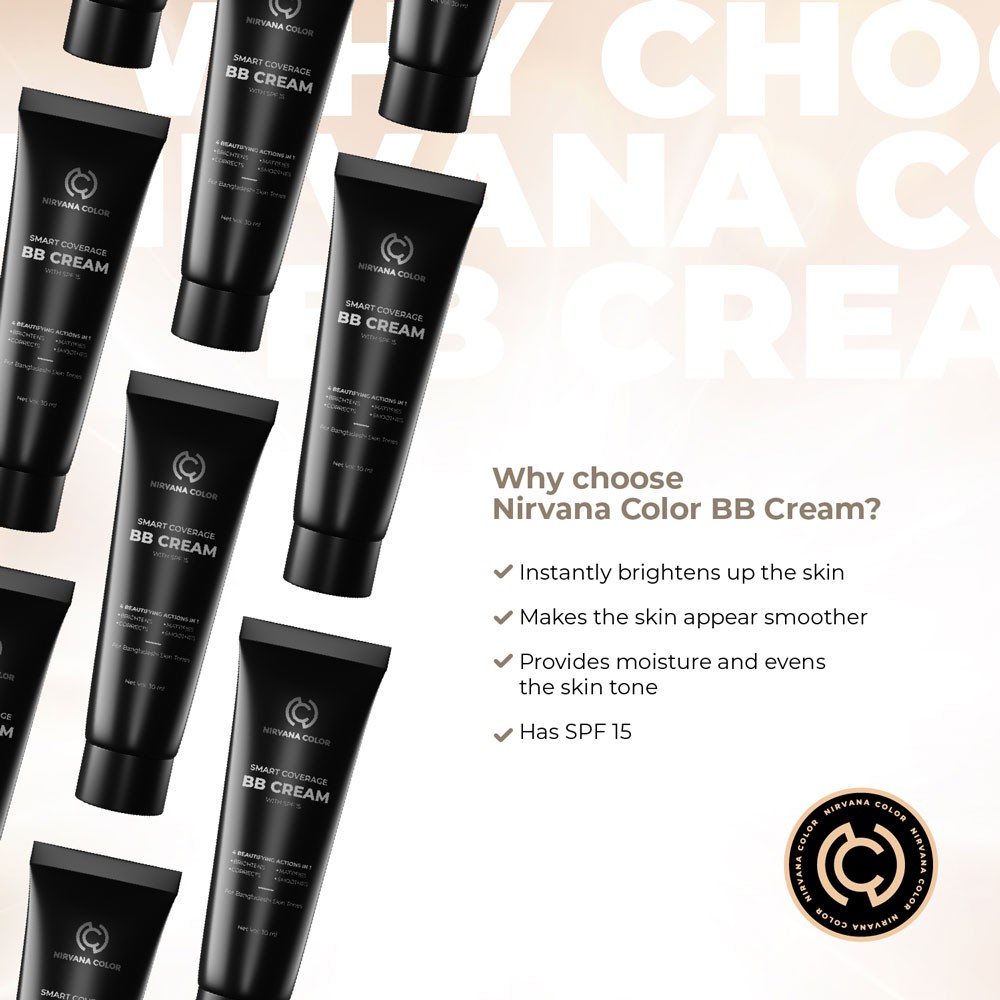 Accentuate your beauty with the NIRVANA COLOR SMART COVERAGE BB CREAM WITH SPF 15. It is a lightweight, matte, and skin-perfecting bb cream made for Bangladeshi beauties. This bb cream is ideal for your everyday makeup look.