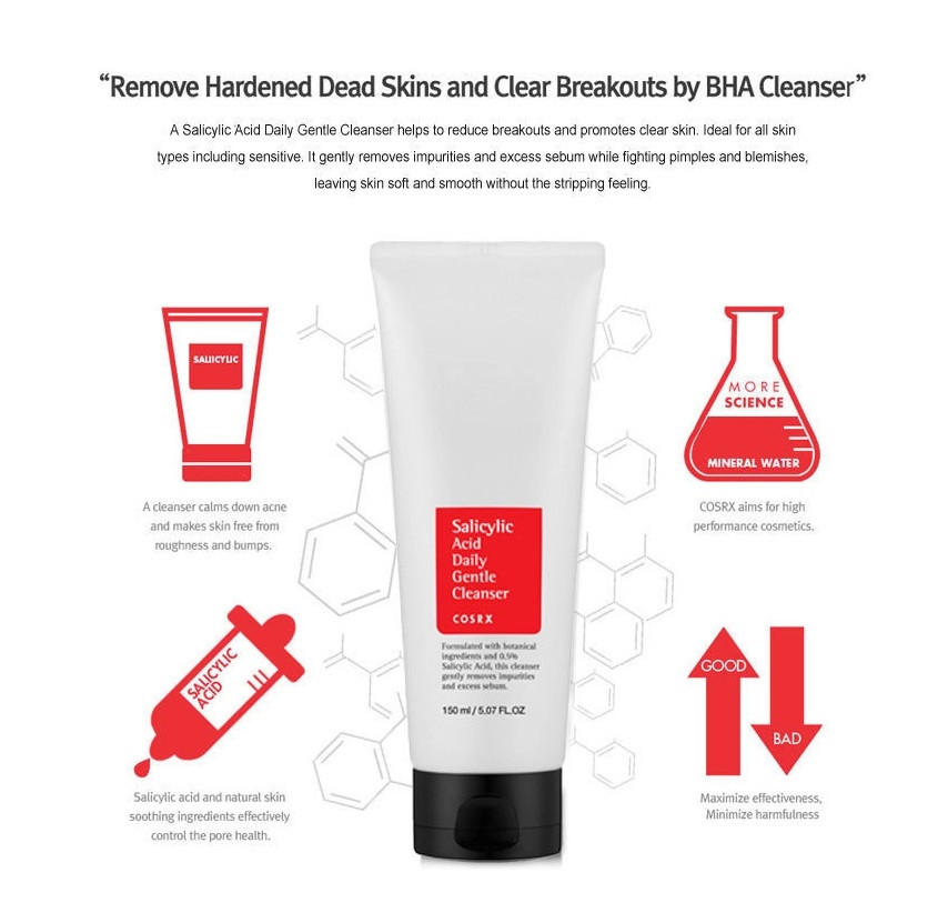 Cosrx Salicylic Acid Daily Gentle Cleanser gently removes impurities and excess sebum while fighting acnes and blemishes, leaving skin soft and smooth without the stripping feeling.