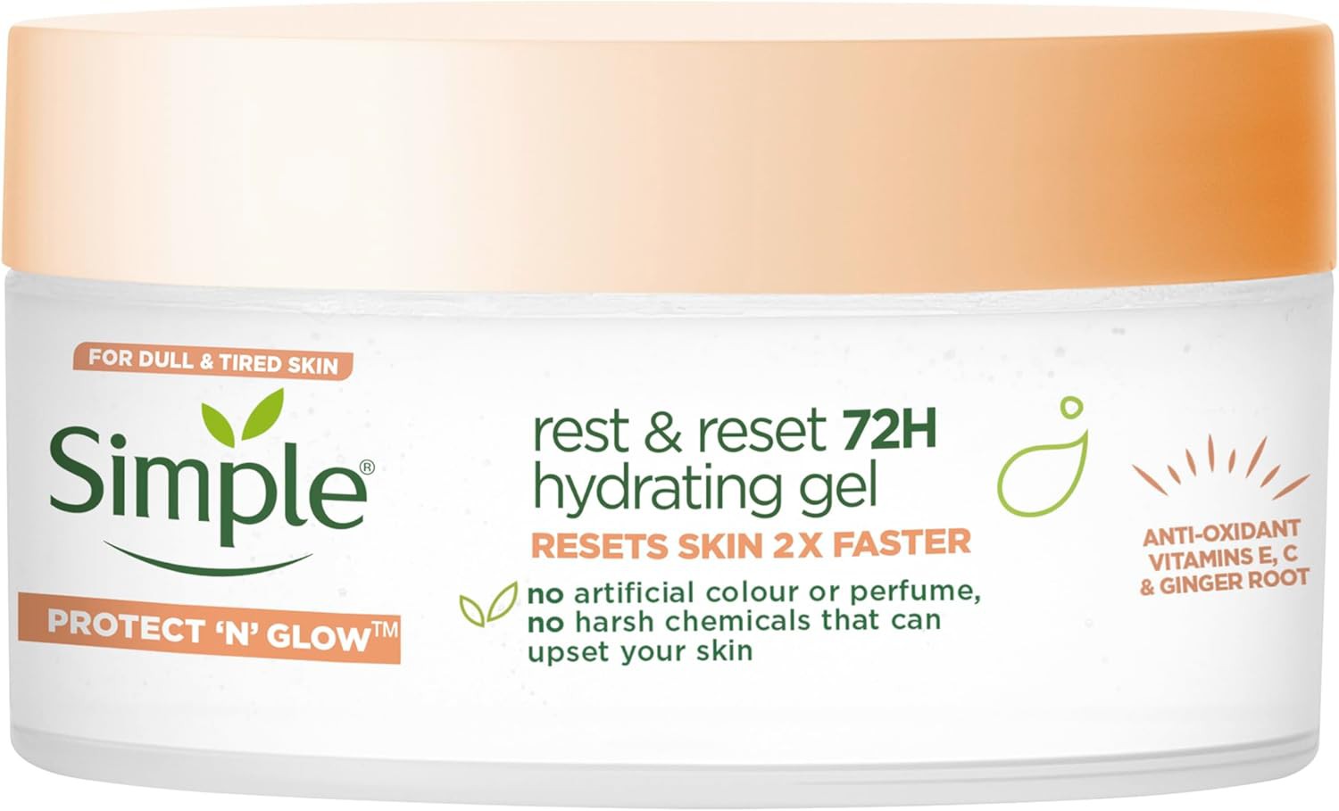 Simple Protect 'N' Glow Rest and Reset 72h Hydrating Gel 50ml 72h Hydrating Gel rests dull and tired skin with brightening antioxidants Vitamin C & E and organic Ginger Root Extract. This gel-textured night cream boosts your skin’s natural renewal process, for glowing skin by morning. Like all Simple products, it’s 100% free from artificial colour and perfume and has no harsh chemicals that can upset your skin.