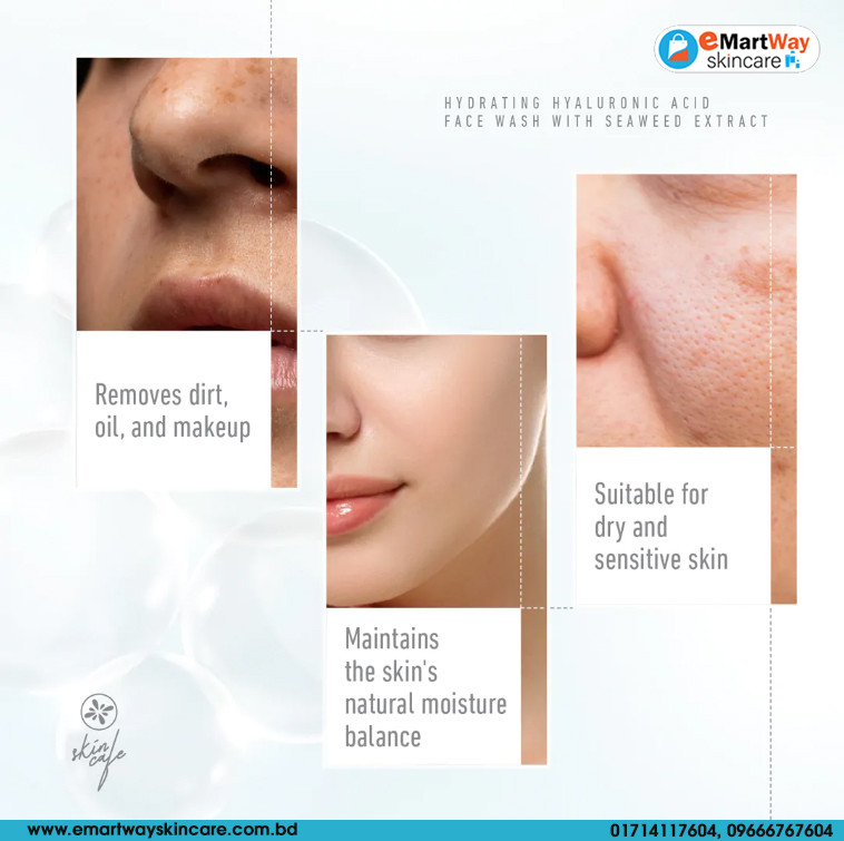 The Skin Cafe Hyaluronic Acid Face Wash contains a blend of nourishing ingredients such as Hyaluronic Acid and Seaweed Extract, which effectively cleanse, calm, and moisturize the skin. It also helps to reduce skin sensitivity, leaving the skin feeling soft and hydrated for an extended period.