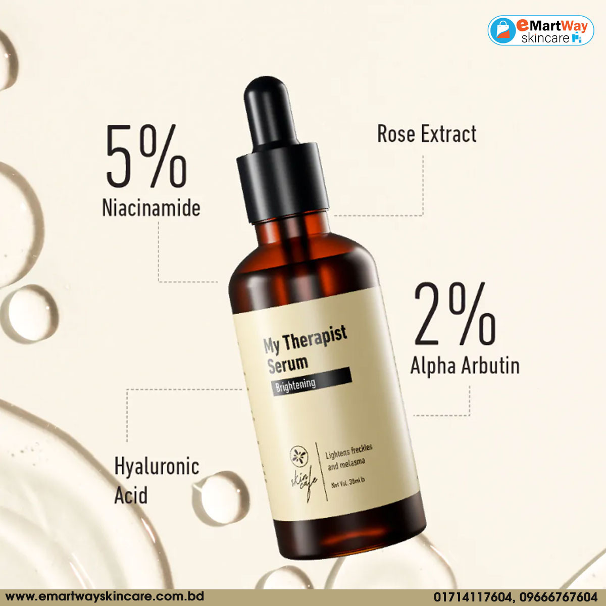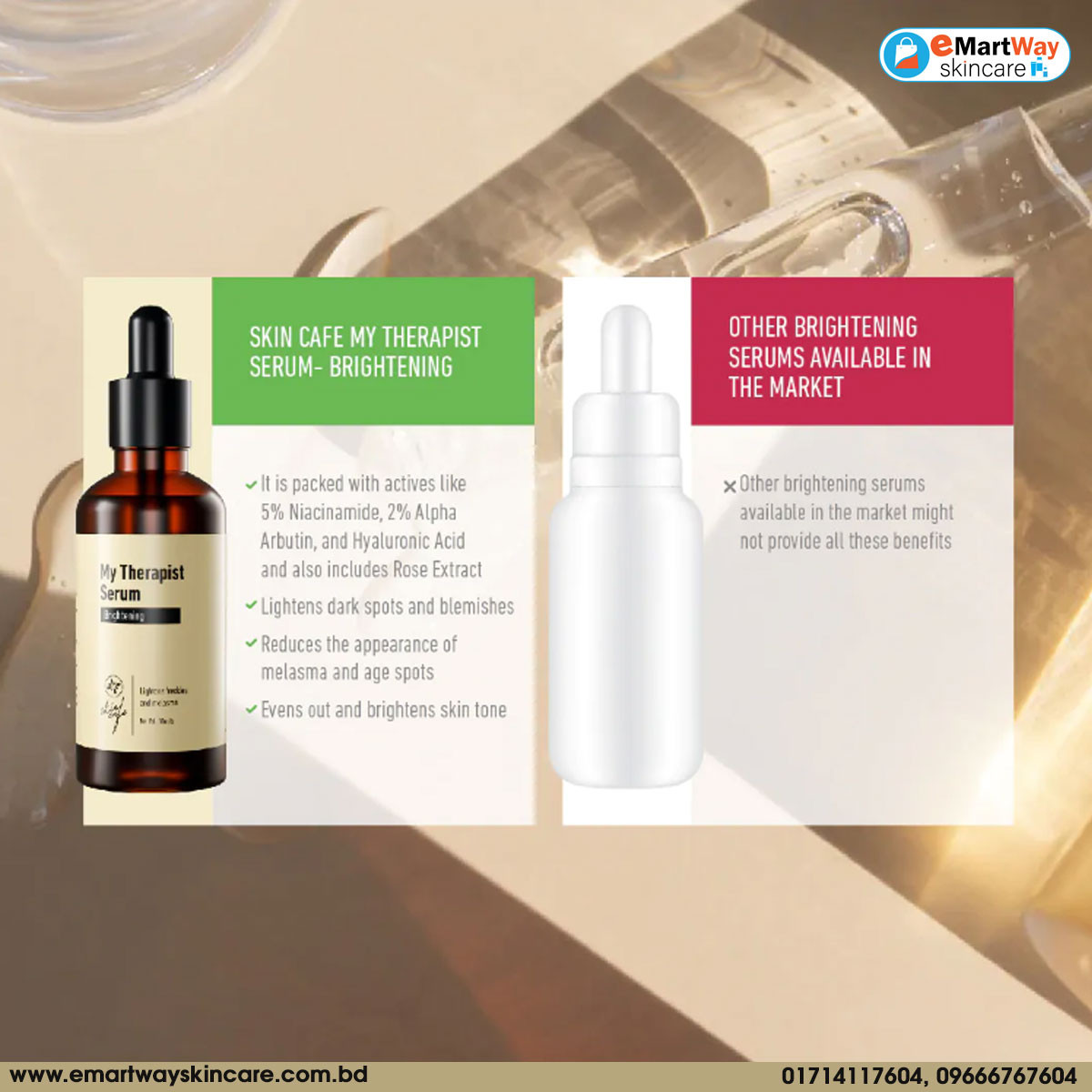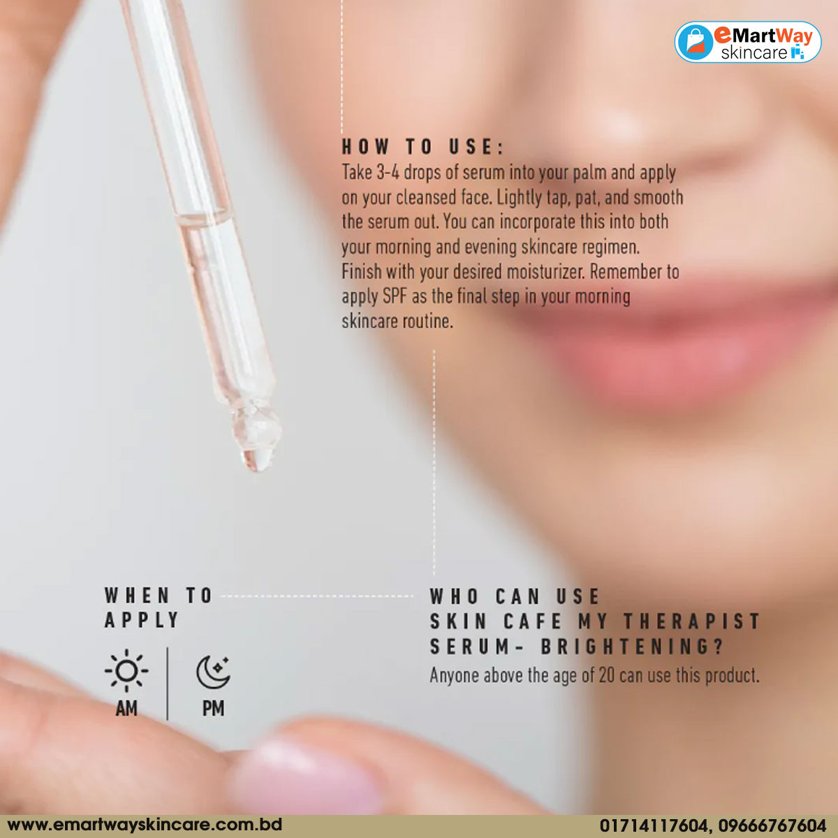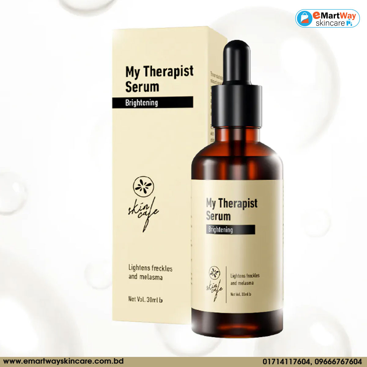 Skin Cafe My Therapist Serum reduces freckles and melasma on the skin and helps to make the skin look bright and lively. It is packed with actives like, 5% Niacinamide, 2% Alpha Arbutin, Hyaluronic Acid and Rose Extract.