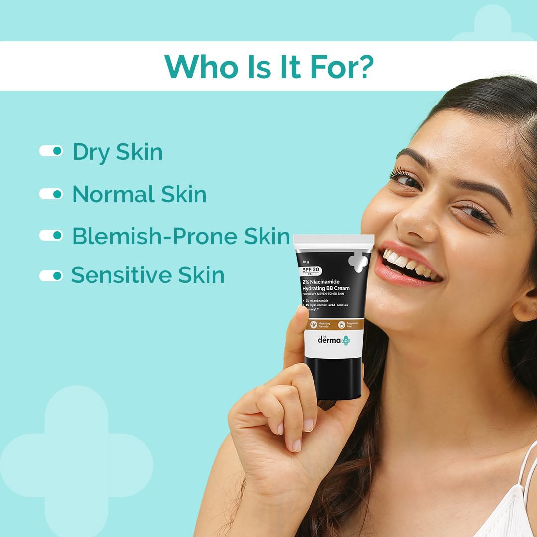 The Derma Co 2% Niacinamide Hydrating BB Cream Make way for our 2% Niacinamide Hydrating BB Cream in Nude Shade with SPF 30, which effortlessly gives you perfect coverage and superbly smooth skin. Power-packed with Niacinamide, it is not just any BB Cream - it evens skin tone and reduces pigmentation while fading dark spots. hen makeup meets skincare, the results are sure to leave you spellbound! Make way for our 2% Niacinamide Hydrating BB Cream in Nude Shade with SPF 30, that effortlessly gives you perfect coverage and superbly smooth skin. Power packed with Niacinamide, it is not just any BB Cream - it evens skin tone and reduces pigmentation while fading dark spots. Ever heard of BB The bb cream derma co of Aquaxyl™ & Hyaluronic Acid holds water molecules onto the surface of your skin to keep it hydrated and smooth.