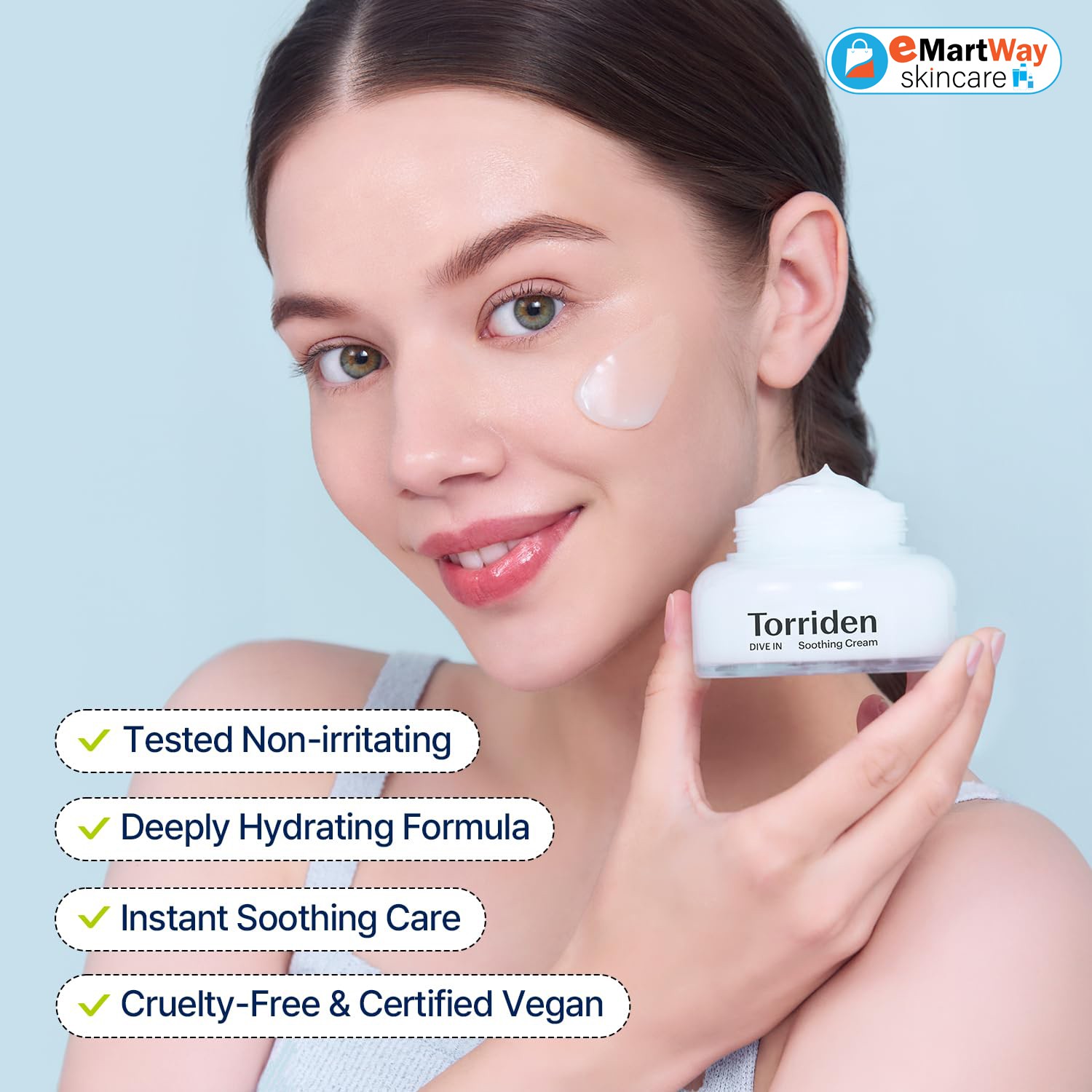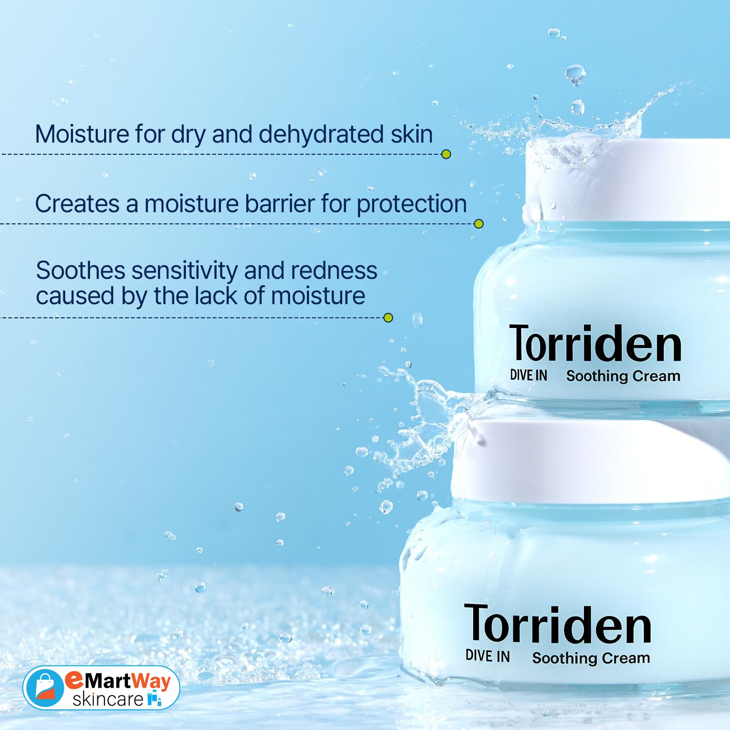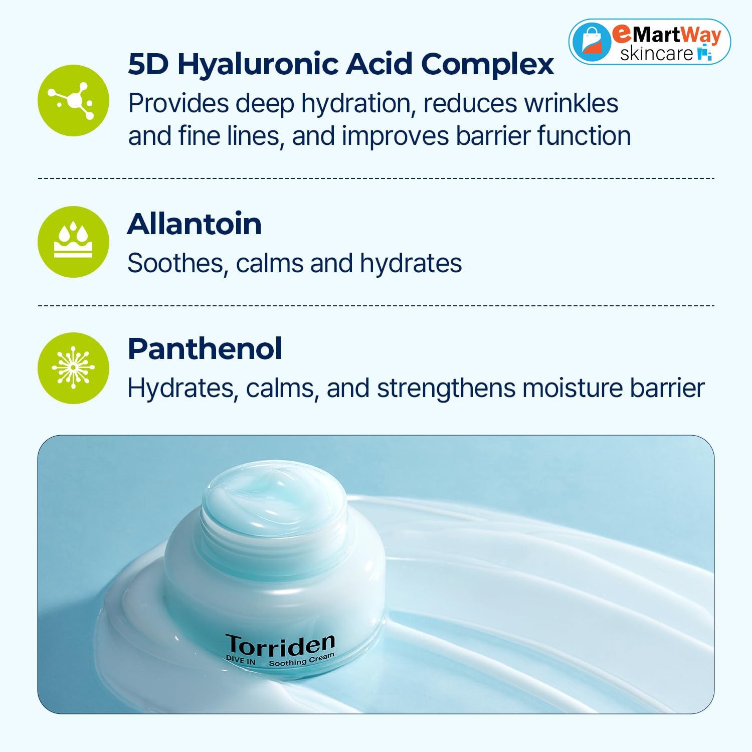 Torriden Dive IN Low Molecular Hyaluronic Acid Cream calms the skin and replenishes moisture. It contains 5D complex low-molecular-weight hyaluronic acid for rapid absorption into the skin, and includes Panthenol and Allantoin to promote skin health.