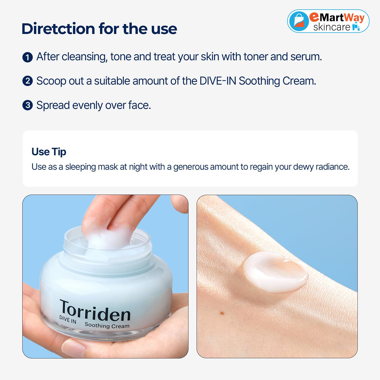Apply a thick layer of product on the desired areas as sleeping pack for intensive moisturizing and soothing care. You may apply on top of the sheet mask for special moisture care.