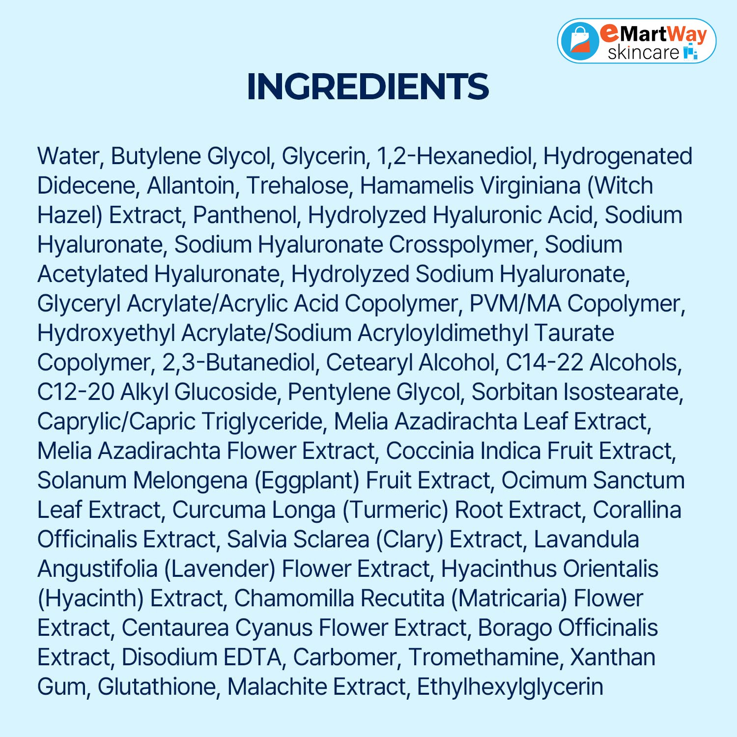 Water, Glycerin, Simmondsia Chinensis (Jojoba) Seed Oil, Caprylic/Capric Triglyceride , Butylene Glycol, Dipropylene Glycol, Cetearyl Alcohol, Ethylhexyl Palmitate, 1,2-Hexanediol, Glyceryl Stearate, Hydrogenated Poly(C6-14 Olefin), Hydrolyzed Hyaluronic Acid, Sodium Hyaluronate, Trehalose, Allantoin, Panthenol , Betaine, Adansonia Digitata Seed Oil, Hydrogenated Rice Bran Oil, Ceramide NP, Ceramide NS, Ceramide AS, Ceramide EOP, Ceramide AP, Phytosphingosine, Stearic Acid, Cholesterol, Thymus Vulgaris (Thyme) Extract, Camellia Sinensis Leaf Extract, Mentha Suaveolens Leaf Extract, Citrus Unshiu Peel Extract, Propanediol, 2,3-Butanediol, Vinyl Dimethicone, Hydrogenated Lecithin, Cetearyl Olivate, Sorbitan Olivate, Sucrose, Carbomer, Tromethamine, Xanthan Gum, Disodium EDTA, Carthamus tinctorius (safflower) flower extract, Ethylhexylglycerin